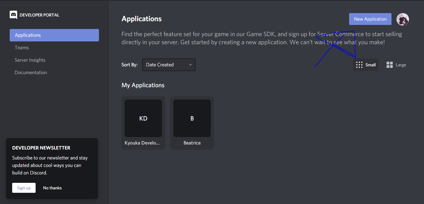 Próximo passo: Acessar o site do portal de Desenvolvedores do Discord com sua conta do Discord (caso ainda não esteja logado) e clicar no botão new application (ou nova aplicação), no canto superior direito da sua tela.