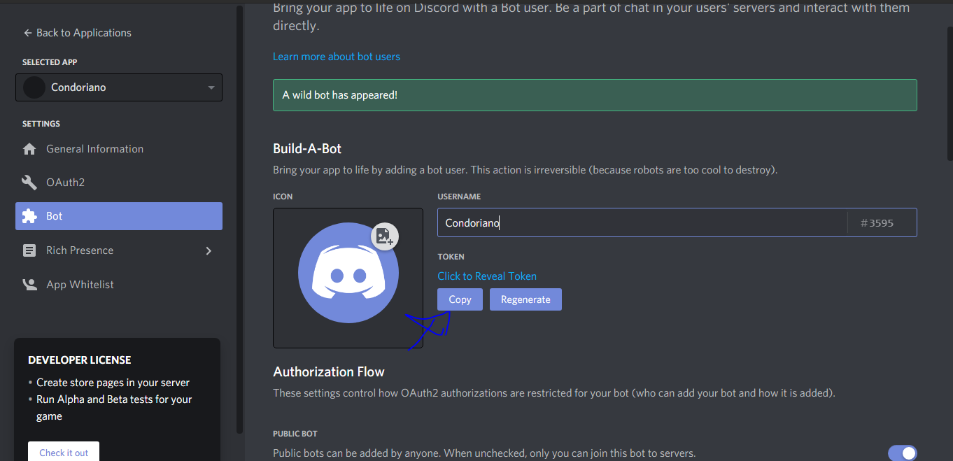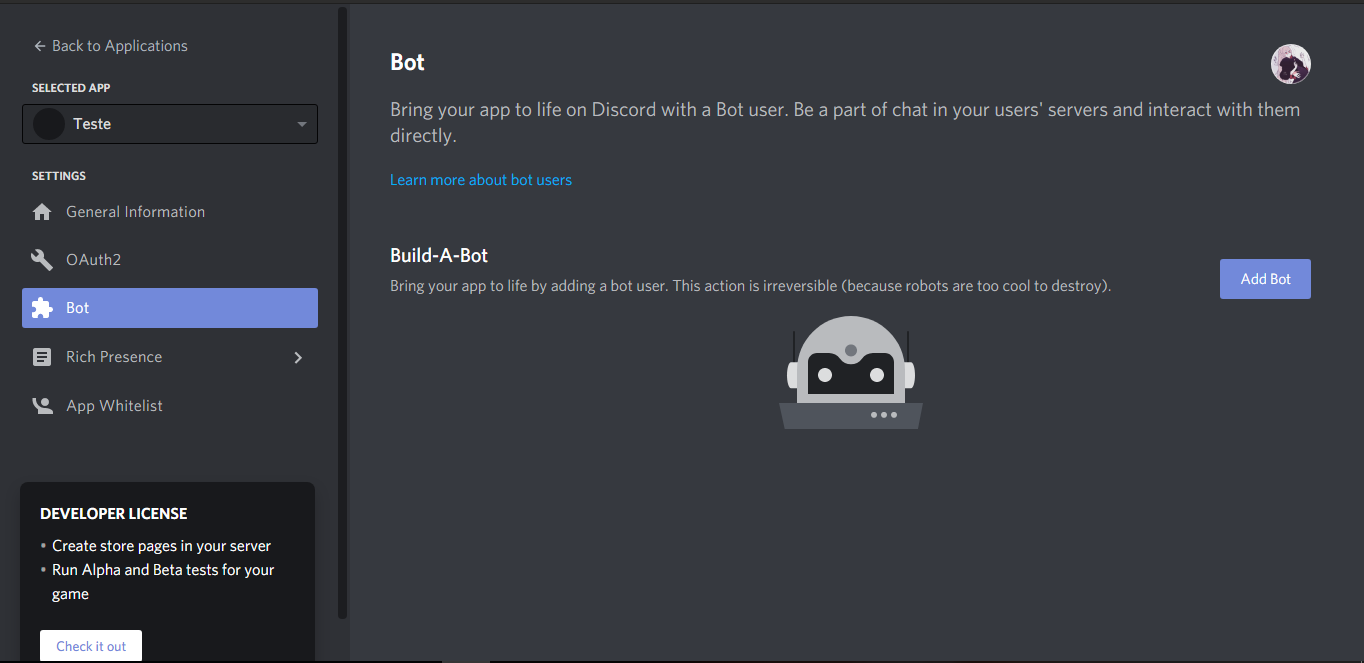 Pronto. Você criou um Bot. Nesta nova tela que abriu, você pode configurar a imagem dele e o nome dele, para caso queira mudar mais a frente.