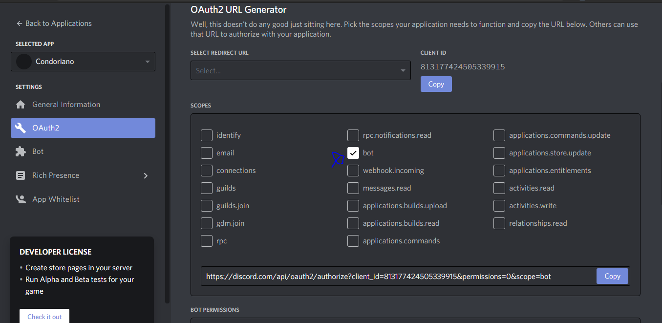 Em seguida, na nossa tela de gerenciamento do BOT, clique em OAuth2 no menu lateral, desça a página até as seguintes opções.